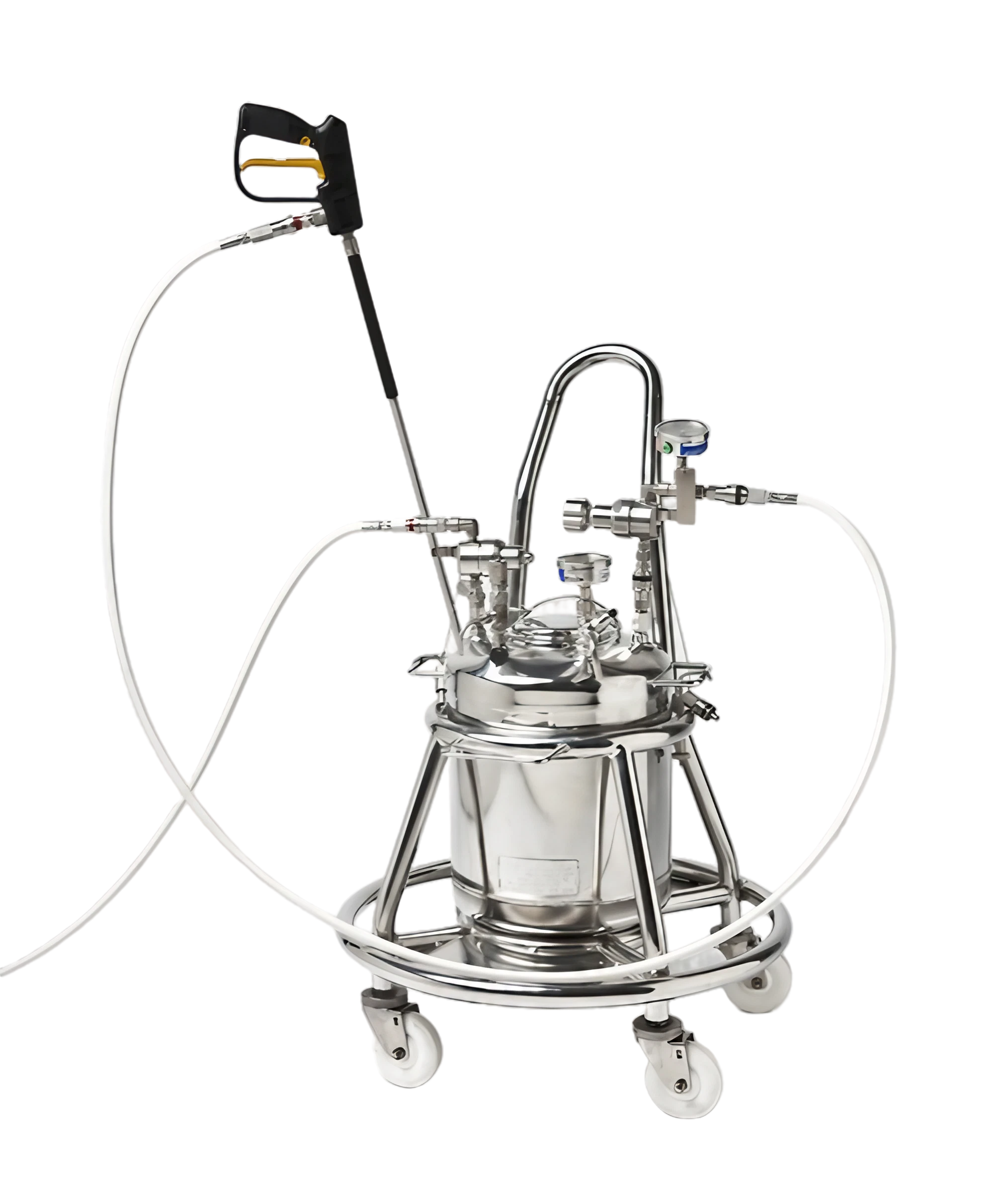 - When configured as a spray or mop system, the operator dispenses disinfectant through a trigger-controlled wand, providing a continuous flow of clean solution through the device and onto the surface.